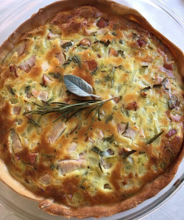 Snipper de uien en de knoflook en fruit deze een paar minuten aan in een beetje boter. Mag niet bruin worden! Ondertussen ontdooien de deegplakken. Snijd de kip in stukjes en de salie en rozemarijnnaaldjes fijn. Klop de eieren en de room door elkaar, voeg de gefruite ui/knoflook toe aan de room evenals de rasp van de schil van de citroen en de kip en de kruiden, peper en zout. Bekleed een ronde ingevette ovenschaal met de plakjes deeg en zorg dat alles goed aansluit. Doe de vulling in de beklede schaal en zet 10 minuten in de voorverwarmde oven. Na deze 10 minuten de stand van de oven op 175 graden zetten en nog 40 minuten afbakken in het midden vd oven.