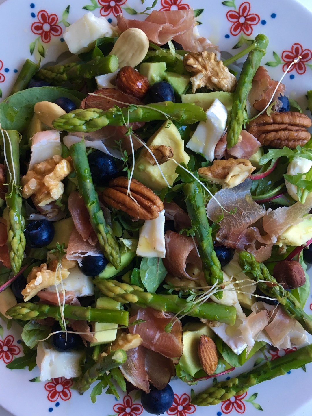 Blancheer/kook de asperges een paar minuten tot ze beetgaar zijn. Laat even afkoelen. Verdeel alles over de borden en klop van de appelazijn (+/- 1 el), olie (+/- 2 el) en honing (+/- 1 tl) een dressing en verdeel over de salade.