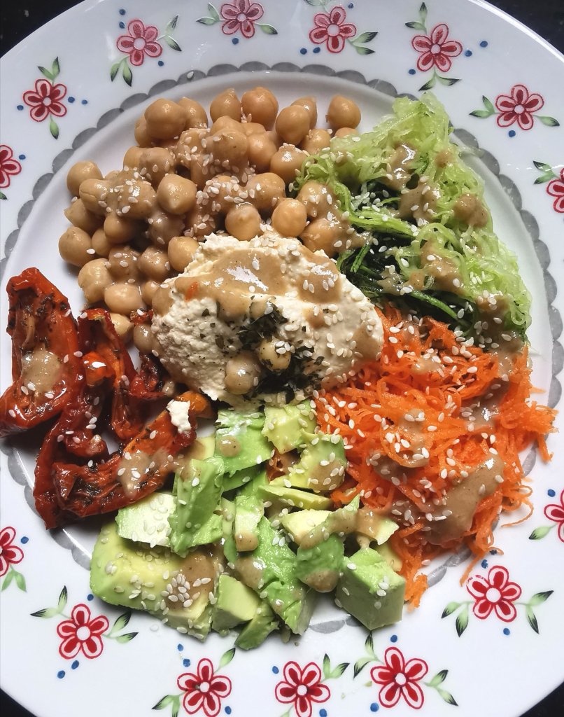 Klop de dressing van de ingrediënten. Rasp de schil van de gewassen wortel en courgette in sliertjes. Snij de avocado in stukjes, evenals de tomaatjes. Doe de kikkererwten uit het blikje in een zeef en spoel een beetje af, laat goed uitlekken. Maak je bord gezellig met de groenten en de erwten en doe de humus erbij. Dressing erover en je hebt een vrolijke lunch 🙂.