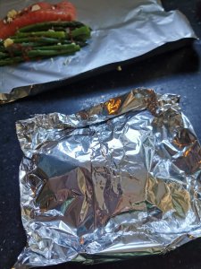 Leg twee keer een lang vel (ongeveer 50 cm) aluminiumfolie op je werkblad en leg de zalm in de lengte op het midden van ieder stuk folie. Strooi er wat peper en klein beetje zout over. Daarnaast leg je de asperges.
