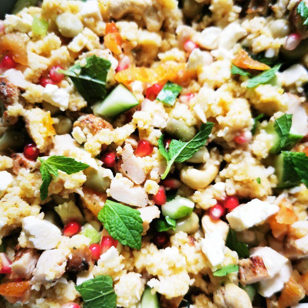 Kook water en maak met het blokje 500 ml bouillon. Bereid de couscous daarmee volgens de verpakking. Terwijl dit gaart, snijd je de abrikozen, komkommer, feta, munt, kip in kleine stukjes. Doe in een kom en schep om. Voeg de afgespoelde en uitgelekte tuinbonen toe evenals de pitjes van de granaatappel en de cashewnoten. Schep een scheutje olijfolie door de gare couscous tegen het plakken eventueel.