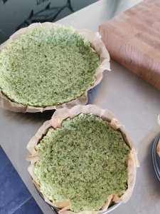 Verwarm de oven voor op 200 graden. Doe de broccoliroosjes (de stronk wordt niet gebruikt) in delen in de keukenmachine en maal fijn. Doe dit in een grote schaal en meng met de amandelmeel, parmezaanse kaas, zout en peper en de eieren. Meng tot een soort deeg.