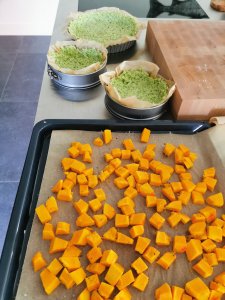 Bekleed de vlaaivormen met bakpapier en een bakplaat ook met bakpapier. Verdeel het deeg over de twee vormen en druk goed aan op de bodem en de randen. Snijd de geschilde pompoen in blokjes van ongeveer 1 à 2 cm. En verdeel over de bakplaat, met peper en zout bestrooien en 1 eetlepel olijfolie erover sprenkelen. Bak de taartbodems en pompoen in 20 minuten in de oven goudbruin.