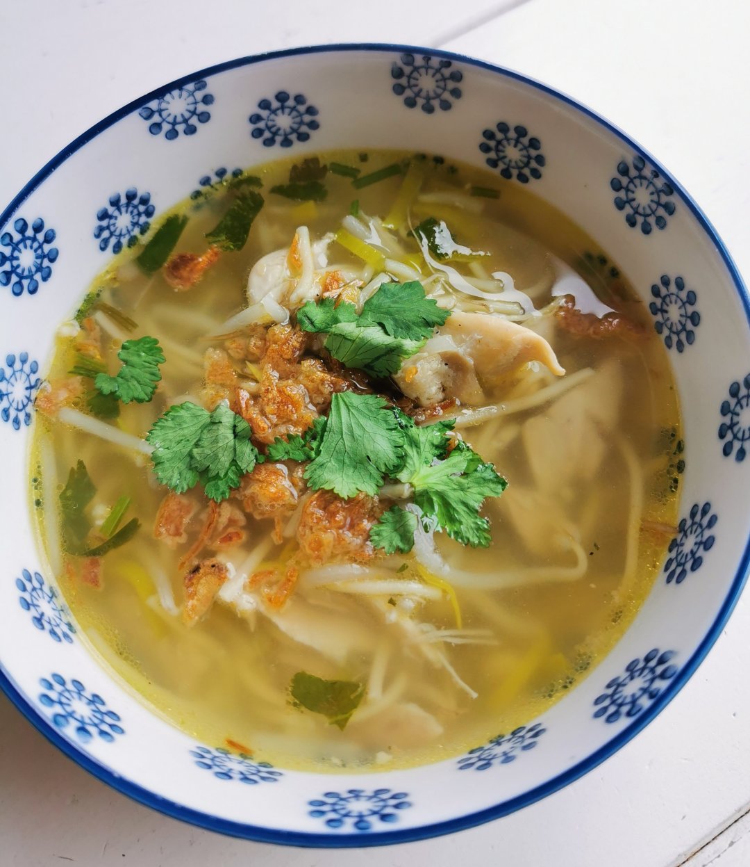 Haal na 1,5 uur de kip uit de pan en laat even afkoelen. Zeef de groenten uit de soep. Haal de kip van het bot en pluk/trek het in stukjes en snij het restje prei in dunne ringetjes. Voeg prei en de kip bij de bouillon, breng op smaak met (flink wat) peper en zout en eventueel het bouillonblokje (blijf proeven) en wat limoensap. Eiermie toevoegen en verwarm nog 5 minuten. Voeg op het laatst de taugé toe en serveer met verse koriander en gedroogde uitjes.